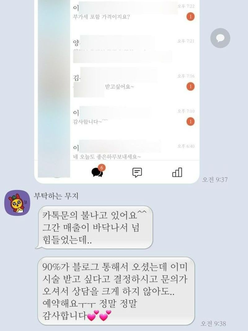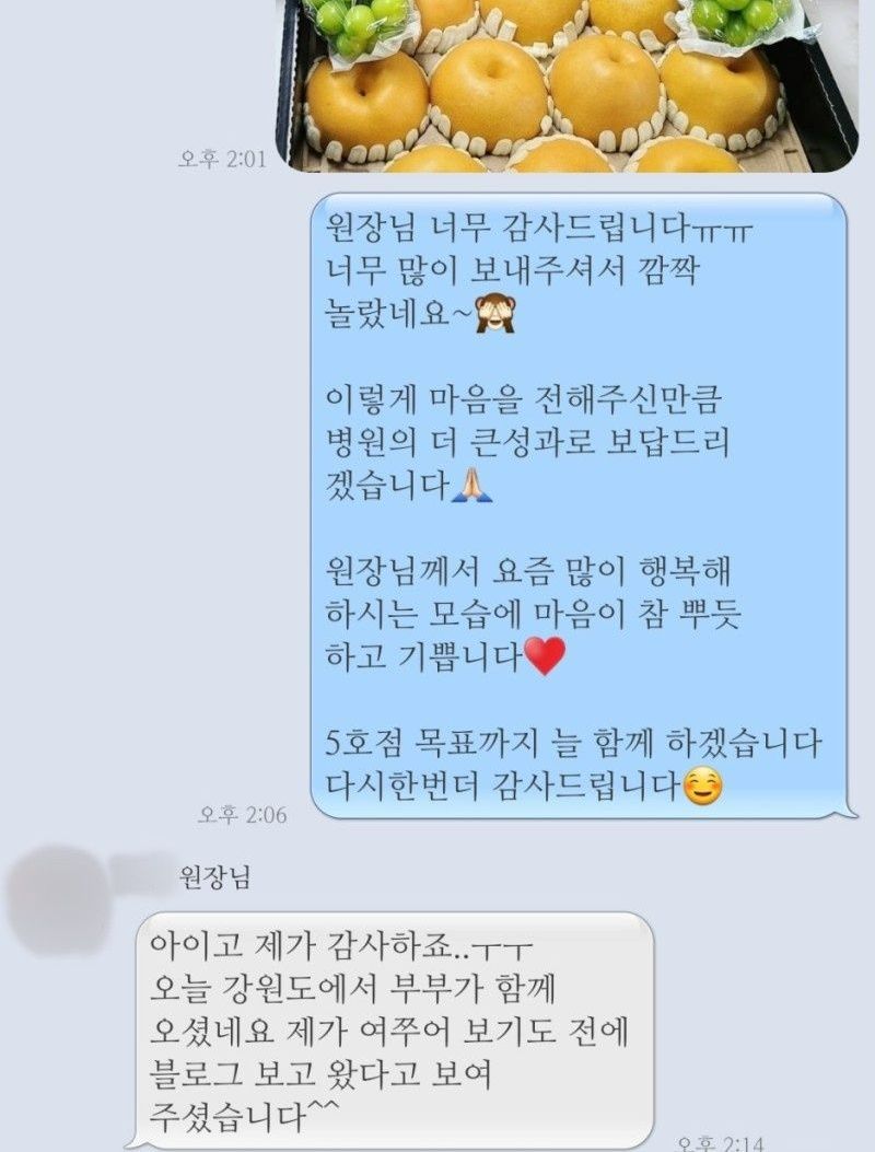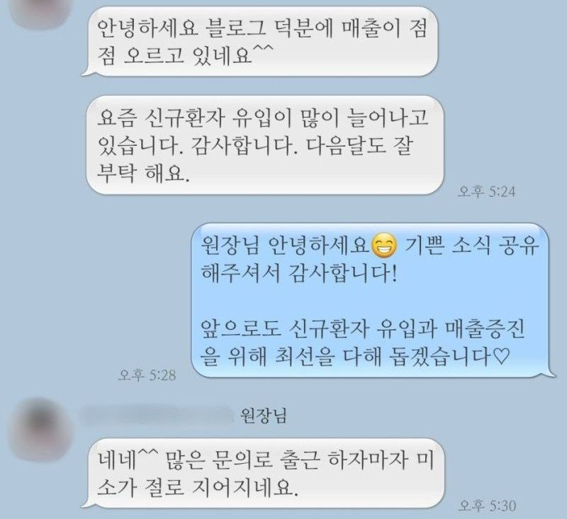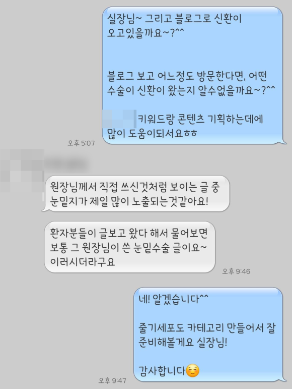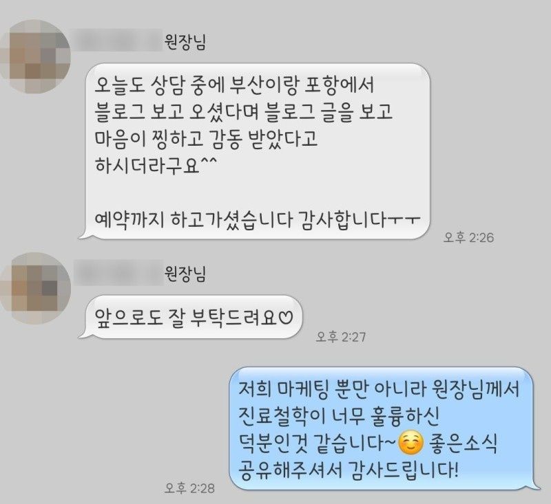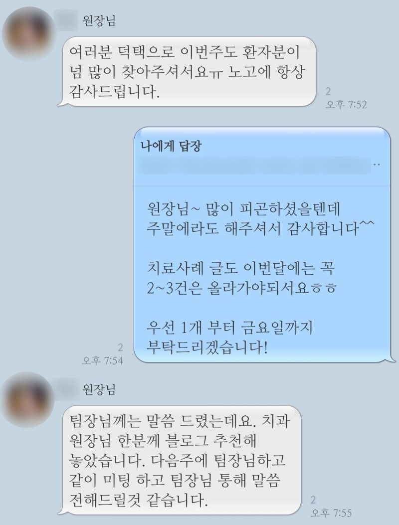 올해 초 저희가 블로그관리대행 해드렸던 대구 지역 원장님과의 카카오톡 소통 내용을 보여드리면서,